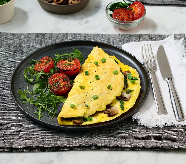 Mushroom and Spinach Omelette: Filling ingredients: 3 tbsp (45 mL) each sauteed mushrooms, wilted spinach (or thawed and well-drained frozen spinach), sliced green onions, and shredded old Cheddar cheese.