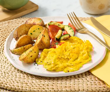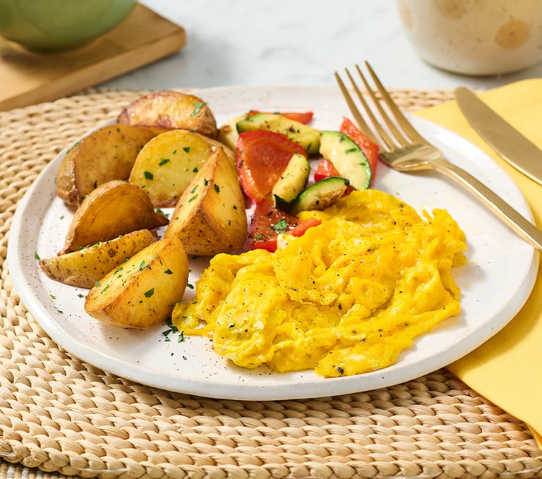 Scrambled eggs are a breakfast staple that anyone can master with a few simple techniques. This recipe keeps things basic with just eggs, butter, salt and pepper. The key is to cook the eggs slowly over medium-low heat, gently moving them as they set to form large, soft curds. For extra creaminess, try whisking in a splash of milk before cooking